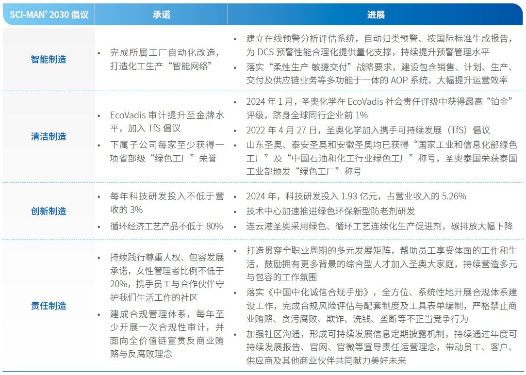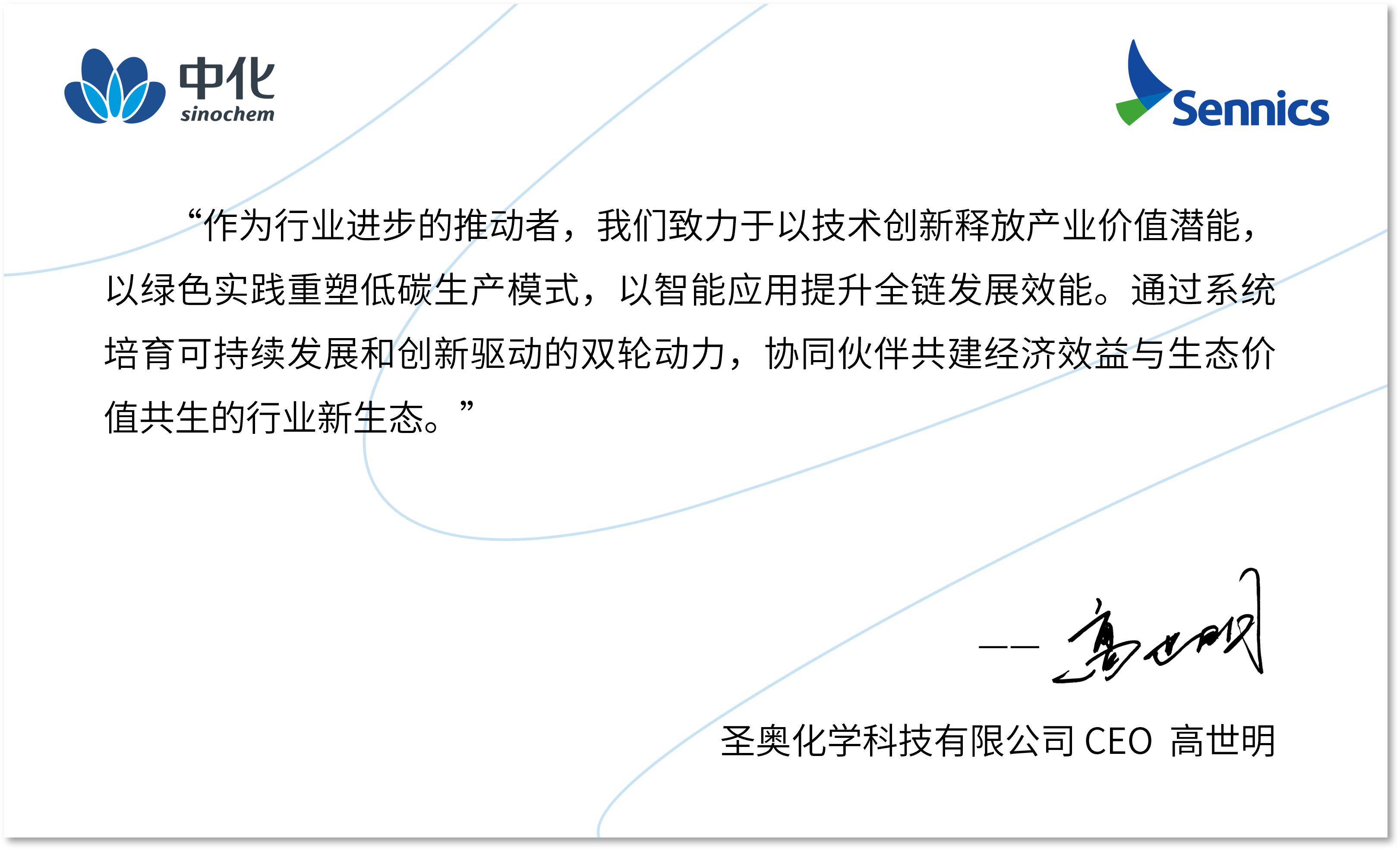 可持续发展已经成为全球共识,是激发科技创新,促进绿色发展,推动化工企业实现高质量发展的必然选择。圣奥化学秉承“客户导向、创新与持续改进、开放与关怀、团队协作、承担责任与敬业”的核心价值观和“极致、绿色”的创新发展观,通过积极构建以“Smart Sennics”为核心的数字化、智能化、服务化战略转型升级目标,以“引领全球聚合物添加剂行业的绿色可持续发展”为使命,全面落实“SCI-MAN+ 2030”倡议,向“成为全球聚合物添加剂用户的最优选择”的企业愿景持续迈进。
