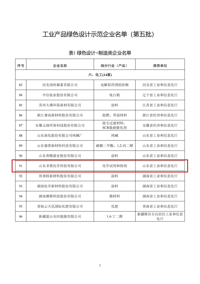 山东圣奥入选工信部工业产品绿色设计示范企业