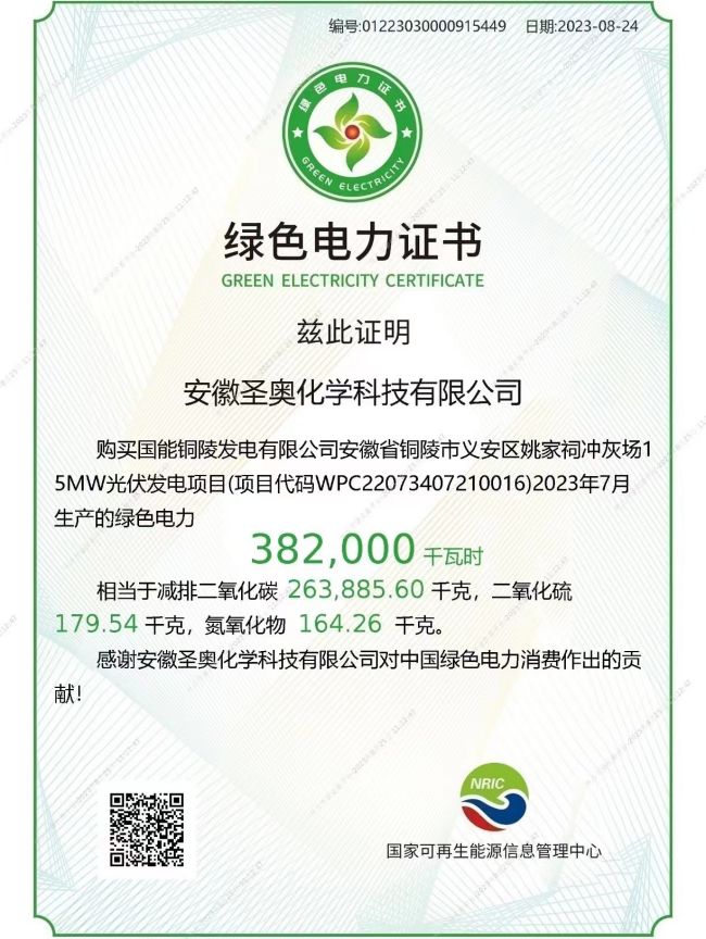 安徽圣奥获得国家可再生能源信息管理中心核发的绿色电力证书,成为安徽省首批使用绿电企业