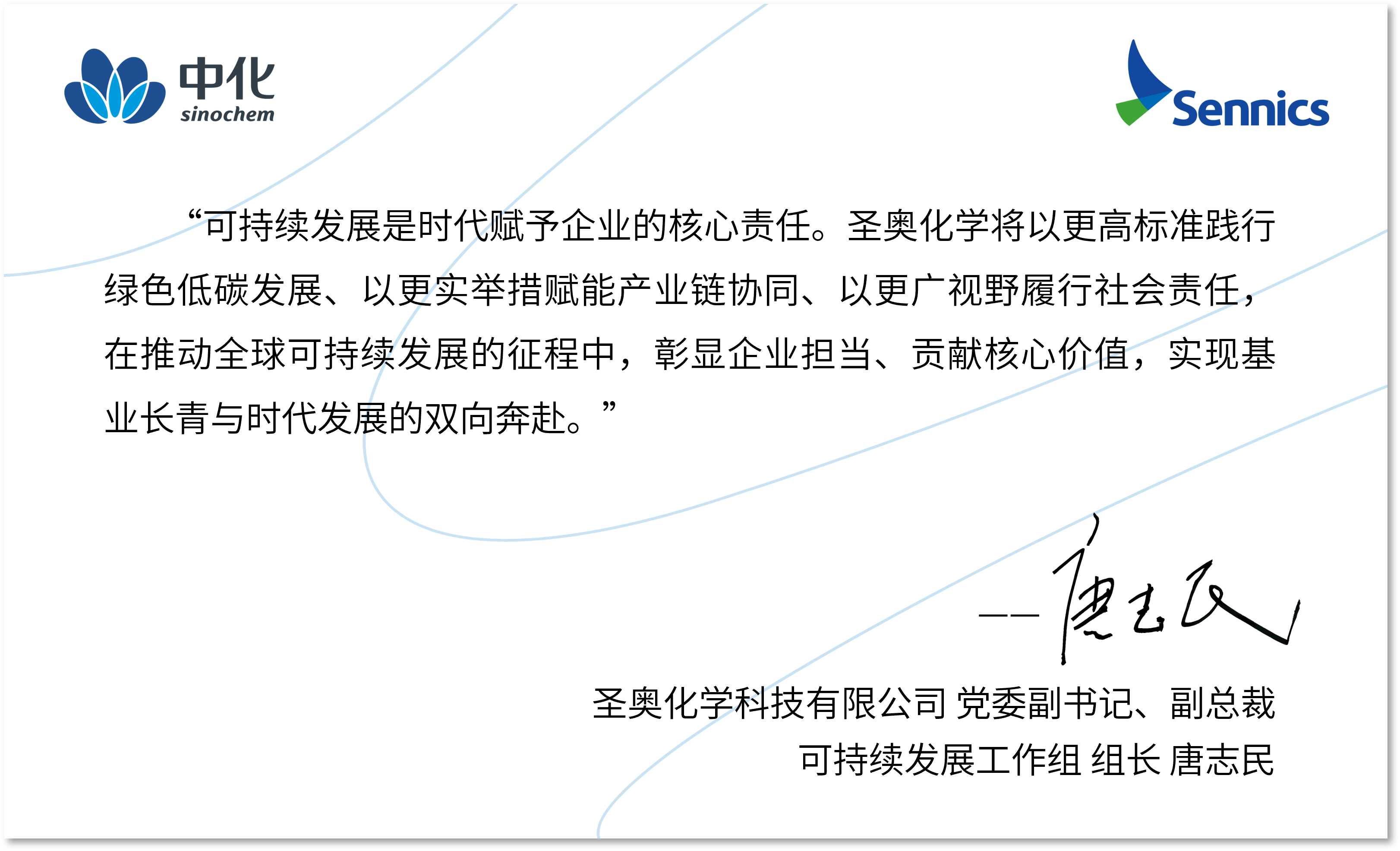 圣奥化学始终认为可持续发展是实现高质量发展的必由之路,坚持以负责任的运营为基础,深化社会责任理念和认知,优化社会责任管理机制和流程,强化社会责任管理和实践,塑造公司可持续发展核心竞争力。对外,公司积极参与并响应国际主流及运营地政府、行业、专业智库等发起的责任倡议,已加入“责任关怀”承诺、“携手可持续发展”(TfS)倡议、金蜜蜂全球CSR2030倡议等,公开宣布我们在环境、社会及公司治理领域的责任承诺。对内,公司自2021年起正式成立可持续发展委员会及下属工作组,定期识别与公司发展相关的风险和机遇,制定并落实可持续发展政策、短中长期可持续发展目标及行动计划,通过组织专项议题培训、召开月度会议等持续提升在环境、社会、公司治理方面的管理能力、决策水平和履责表现;定期审核目标与计划的完成情况,并根据最新发展要求、公司现状等滚动更新年度目标,必要时调整中长期目标,以保障战略方向与内外部环境同频共振。