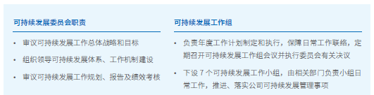可持续发展委员会作为公司可持续发展工作主要责任机构,负责审议可持续发展工作总体战略、目标、整体规划与绩效等。委员会下设可持续发展工作组,由公司副总裁担任组长,组员包括相关部门负责人。可持续发展工作组下设健康安全环保质量、低碳发展、创新发展、劳工与人权、商业道德、可持续供应链、品牌传播与综合治理共7个工作小组,包含HSE部、运营中心、产业发展部、技术中心、营销中心、人力资源部、工会、法律合规与知识产权部、审计部、采购部、行政与公共关系部等主要职能部门,对公司可持续发展事宜承担具体责任,每年检讨具体议题可持续发展政策及目标完成情况。