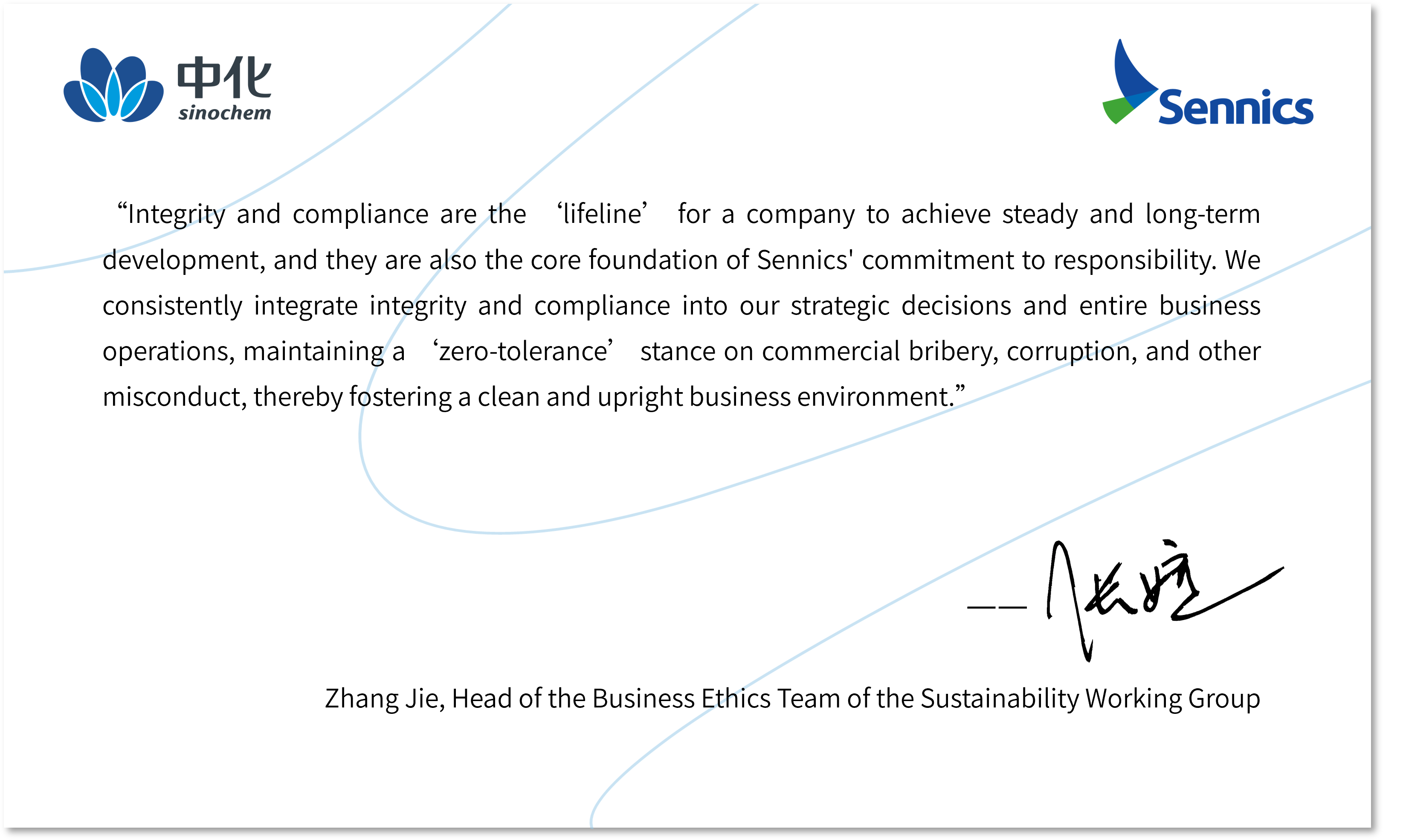 Sennics adheres to the strategic goal of "becoming a leading global company in high grade, precision and specialty chemicals", integrates the idea and standards of Sustainability into corporate governance, and devotes itself to implementing responsible business operations with high ethical standards to ensure that the business conforms to international norms and laws & regulations on fair competition, anti-money laundering, anti-bribery and anti-corruption in all operation sites. The company improves related system and mechanism construction from the aspects of legal and regulatory compliance, anti-corruption, data security and intellectual property protection. The Business Ethics Team (including Legal Compliance & IPR Department, Auditing Department, Operation Center, etc.) under the Sustainability Working Group takes charge of promoting and implementing relevant work, standardizes its own behaviors according to the Integrity and Compliance Manual of Sinochem Holdings, the Compliance Obligation Convention of Sinochem Holdings, the Compliance Responsibility Agreement,and the Anti-Commercial Bribery Compliance Manual of Sinochem Holdings, continuously improves overall risk management, and conducts more active communication, to win the trust and support of stakeholders through standardized operation and transparent management, lay a good governance foundation for the company to achieve Sustainability, and join hands with partners to establish partnerships featuring mutual respect, mutual trust and fair trade.