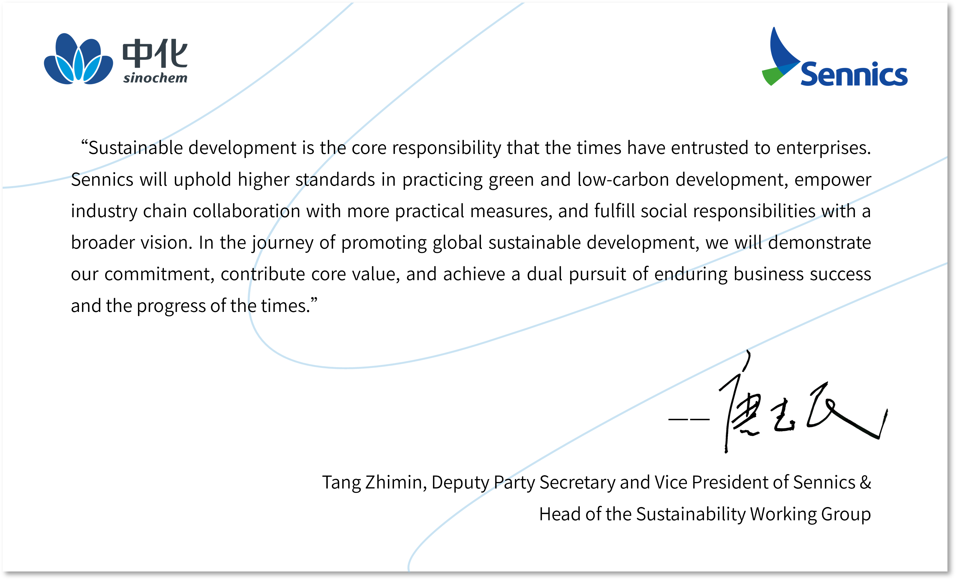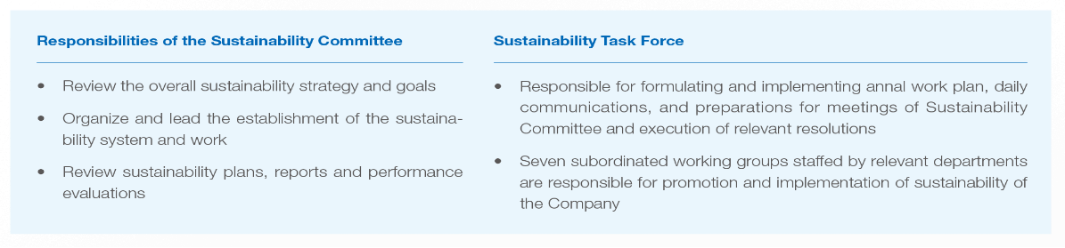 As the main entity responsible for the company's sustainability efforts, the Sustainability Committee is responsible for reviewing the overall strategy, objectives, overall planning, and performance of sustainability work. The Sustainability Task Force led by Vice President of Sennics was established under the Committee, and its members include leaders of relevant departments. There are seven working groups under the Sustainability Task Force, namely Health, Safety, Environmental Protection and Quality (HSEQ), Low-carbon Development, Innovative Development, Labor and Human Rights, Business Ethics, Sustainable Supply Chain, Brand Communication and Comprehensive Governance, including HSE Department, Operation Center, Industry Development Department, R&D Center, Marketing Center, Human Resources Department, Labor Union, Legal Compliance & IPR Department, Auditing Department, Purchasing Department, Administration and Public Relations Department and other functional departments. They not only carry out responsible for dealing with specific sustainability matters of Sennics, but also review specific issues, sustainable development policies and progress against the related goals every year.